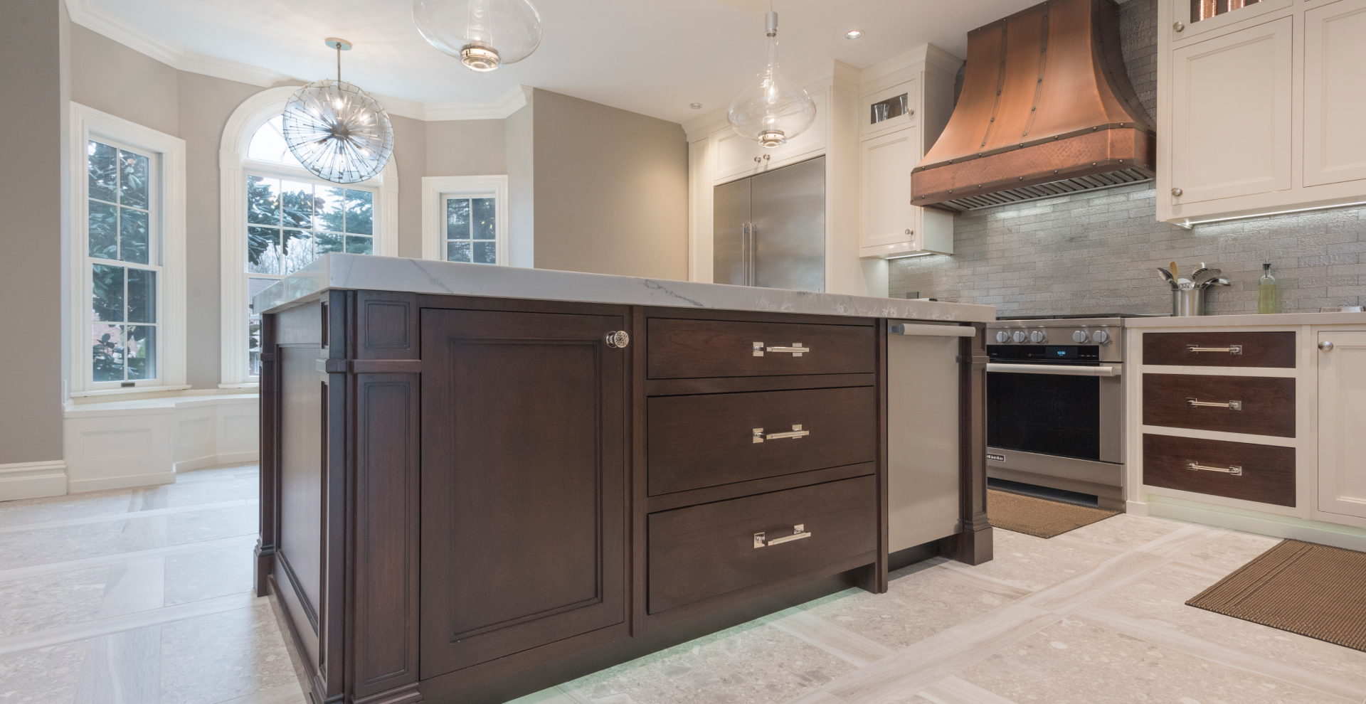 نصب کانتر و صفحه روکابینتی مجزا از رنگ کابینتها، ترفند دیگری است که به زیبا نمودن کابینتهای آشپزخانههای دو رنگ کمک میکند.
